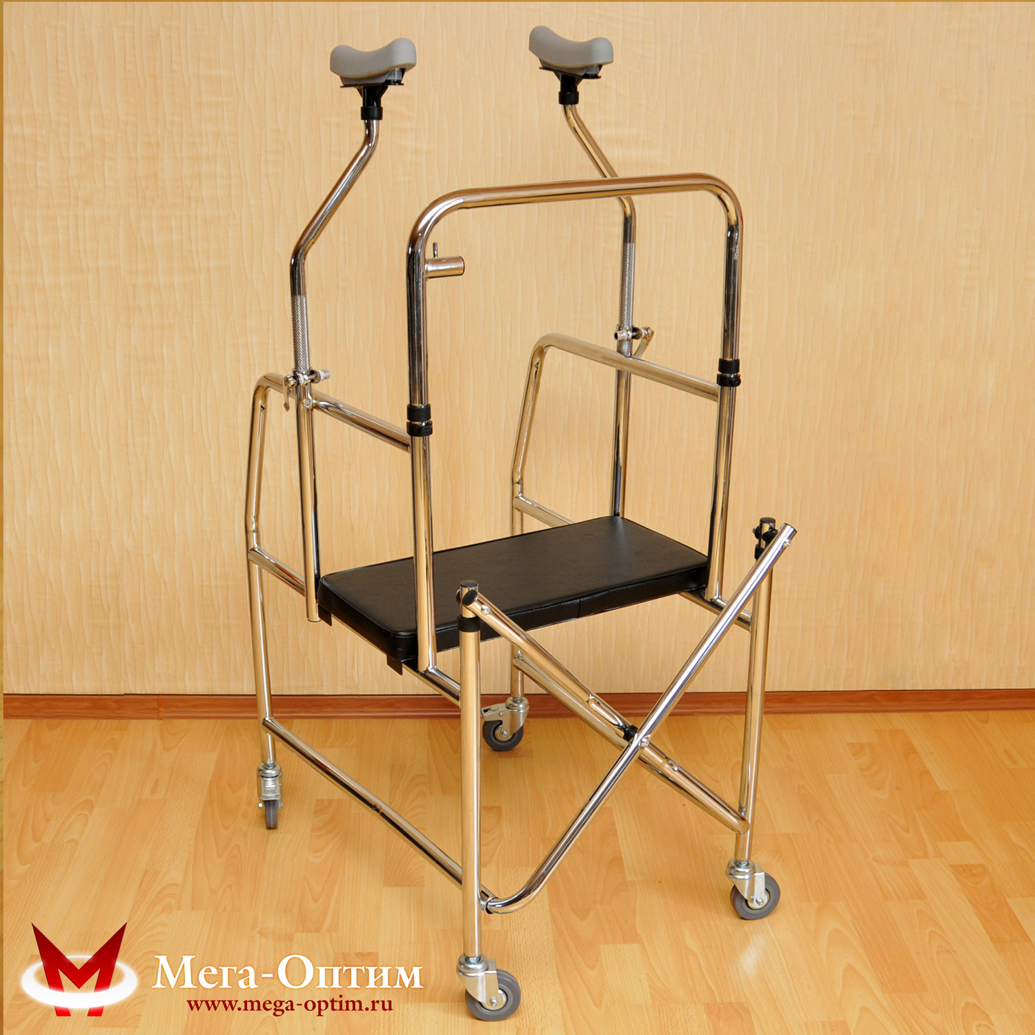 На стойках мягкие подмышечники, регулируемые по высоте и ширине. Конструкция снабжена съемным сидением для отдыха.